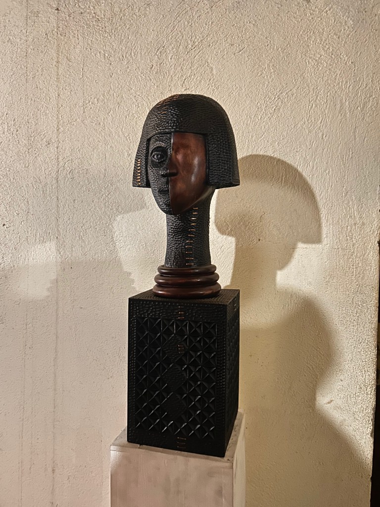 We visited the studios of Claude Nizeyimana and Richard Mwizerwa. Nizeyimana’s sculptures left me captivated in his dimly lit studio, adorned with black and brown wooden and copper busts that sit on sculpted crates. Half of the figure’s face is hollowed and smoothed out, while the remaining half depicts the facial structures that demand your attention.