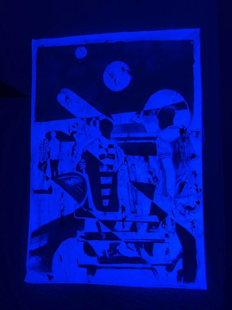 Mwizerwa’s richly textured, vibrant-in-depth landscape paintings met us at the door, but it was really these abstract figurative paintings, flooded by UV black light and taking on new life, that bolted me in place. In these paintings, Mwizerwa brings us on his journey of observing everyday life and activity in Kigali. Circles and curved rectangular shapes intersect the scene, offering glimpses of the many figures and objects that meet Mwizerwa on his daily walks.