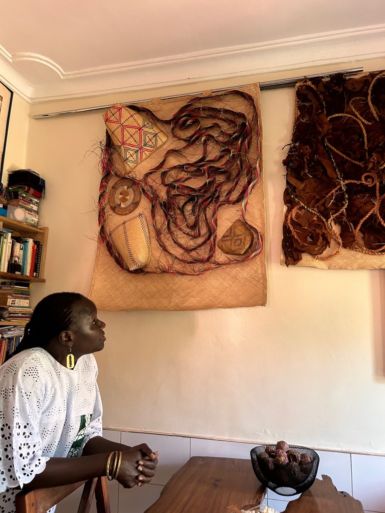 The studio visit with Acaye Kerunen often lingers in my heart. The tender hug we shared upon entering, the combination of coffee and popcorn awaiting us inside, and the warm way Kerunen guided us through her sculptural artwork process were nothing short of incredible. Kerunen spoke of how she opens her home and studio to women in the community to gather, share stories, and create work together, as this aspect heavily informs her work, which seeks to dismantle and investigate colonialism in African women’s artistry, such as weaving. I honestly could have stayed in that space and listened to Kerunen’s stories for days.