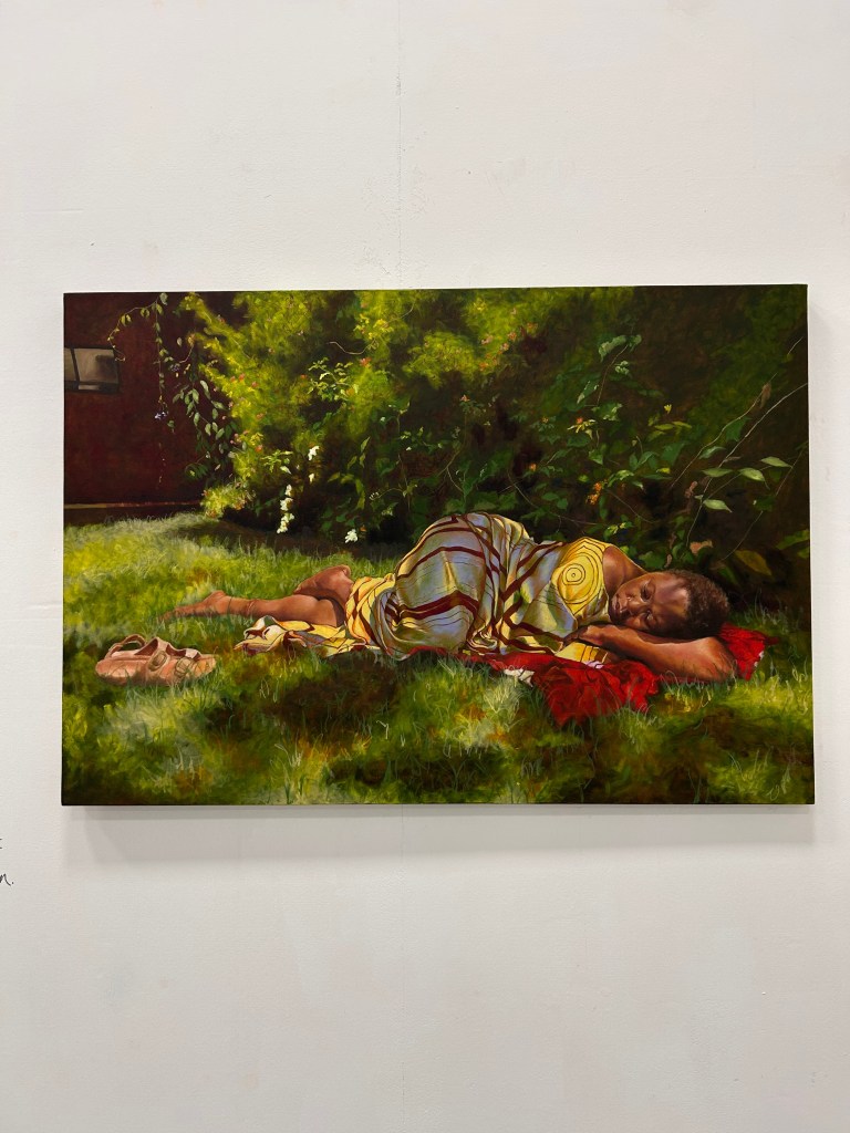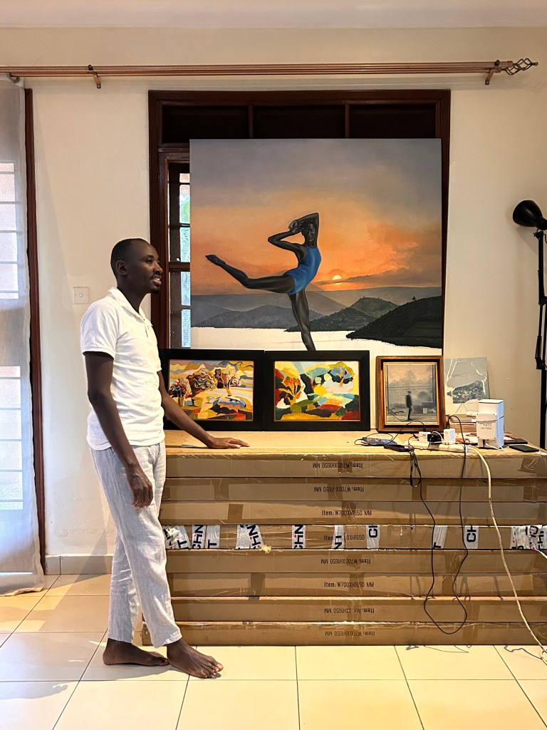 I’ve been a massive fan of Ian Mwesiga’s work for quite some time now and have always been so drawn to the figures in his work. There seems to be a consistent reflective act in his work, where the figure stands in mirrored moments, yet there is a moment when the viewer is confronted and almost left to reflect on the scene. Seeing more of his work up close and talking to him more about his practice left me starstruck. In these moments, I found myself pinching myself to remind myself that I am experiencing this magical journey of being warmly guided in the homes, studios, and gallery spaces of Rwandan and Ugandan artists and practitioners who are making incredible work and taking up space, while allowing room for so many others.